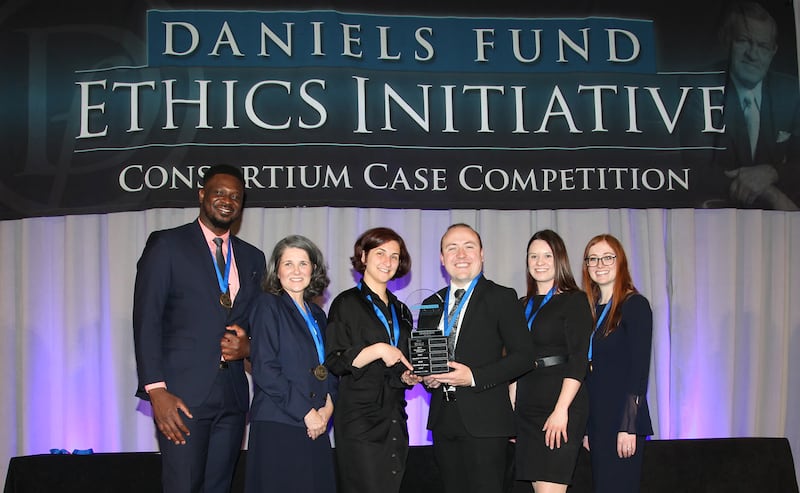 The competition immerses college students in a challenging business ethics case, mirroring real-world scenarios, and equips them with practical tools for ethical decision-making to apply in their future careers. Teams were evaluated using the Daniels Fund Ethics Initiative Principles: integrity, trust, accountability, transparency, fairness, respect, rule of law, and viability.