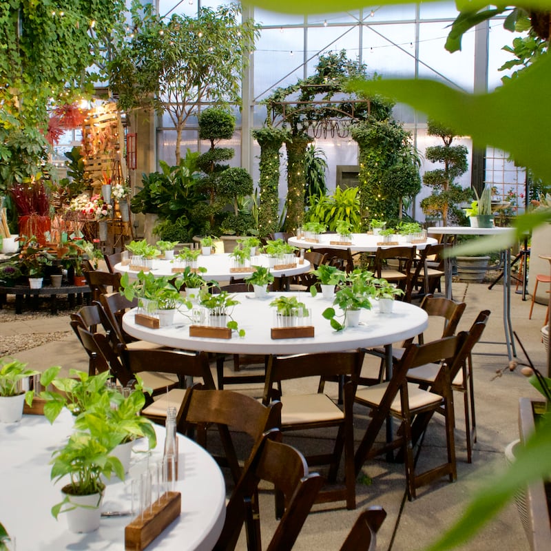 One of the benefits of using a greenhouse for an event is that there is often very little additional decorating needed because partygoers are already surrounded by a colorful array of plants, fountains and statues. “The space is already beautiful,” Harbin says. “If you just walk in here, it’s already set up, so there’s not a lot that needs to happen.”