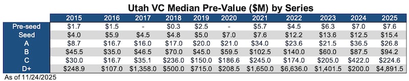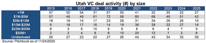 *All data was pulled from Pitchbook on November 25th, 2025. According to Carta, the busiest deal month in venture is December. It is highly probable that 2025 Utah deal values and counts have ended up significantly higher than what is disclosed here.