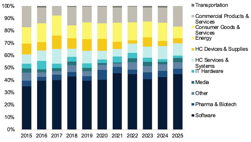 Software dominance continues while healthcare establishes strong secondary position