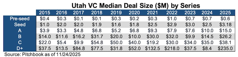 Series A tells a more selective story: median deal size jumped sharply to $15 million, even as median pre-money valuations pulled back from 2024 highs, reflecting fewer but more conviction-driven A rounds. At the later stages, volatility dominated. Series B and C valuations rebounded meaningfully alongside larger check sizes, reinforcing that Utah companies able to reach durable scale continue to attract significant capital. Meanwhile, the dramatic swings in D+ valuations and deal sizes highlight the outsized impact of a small number of mega-rounds. Overall, the data underscores a Utah venture ecosystem that rewards traction, revenue and capital efficiency at every stage.